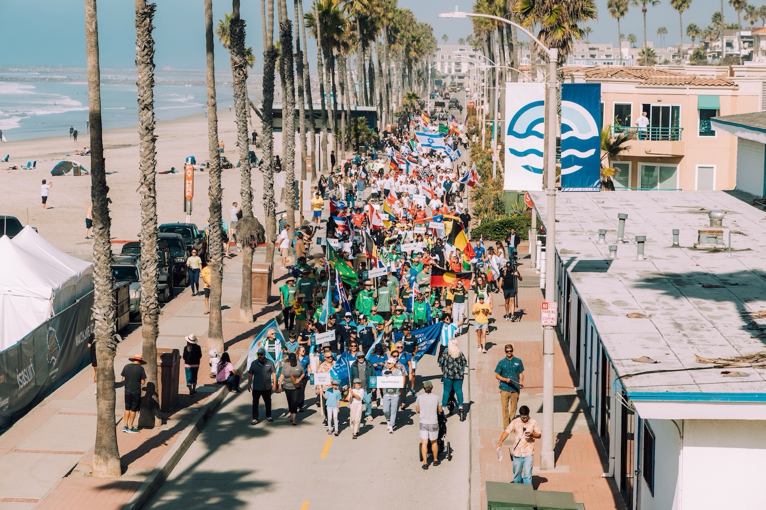 Casi 140 atletas, representando a 24 equipos nacionales y 9 diferentes categorías de Para Surfing, participaron en el Desfile de las Naciones. Los equipos marcharon por The Strand con las banderas en alto, antes de reunirse en el anfiteatro Junior Seau Beach para la ceremonia Sands of the World, sello distintivo de la ISA. Un miembro de cada equipo nacional vertió arena de su playa local en un solo contenedor, símbolo de la unión pacífica de las naciones del mundo a través del surf.