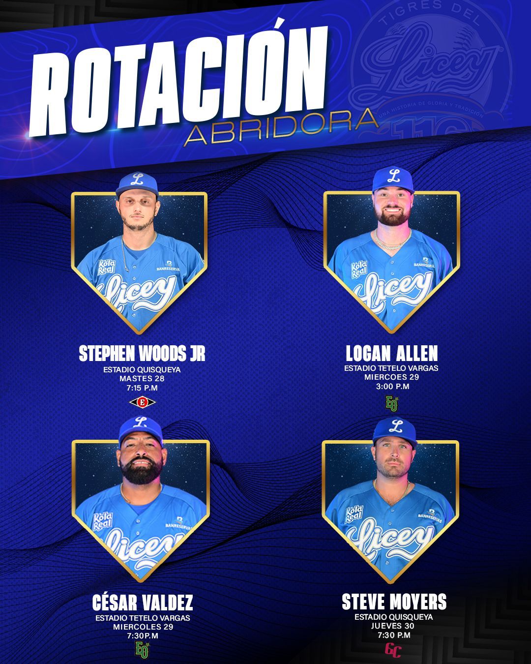 Para el miércoles 29, en una doble cartelera ante las Estrellas Orientales en el Estadio Tetelo Vargas, el zurdo Logan Allen subirá al montículo, para el primer compromiso que está pautado para las 7:30 de la noche. Mientras que para el segundo enfrentamiento, el derecho César Valdez será el lanzador abridor.