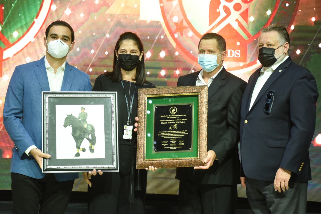 Maribel Haché hija de Kalil, Arístides Fernández Zucco y Jacinto Díaz Haché, recibieron el reconocimiento en representación de la familia, entregado por César Ureña, presidente de la Asociación de Cronistas Deportivos de Santiago (ACDS).