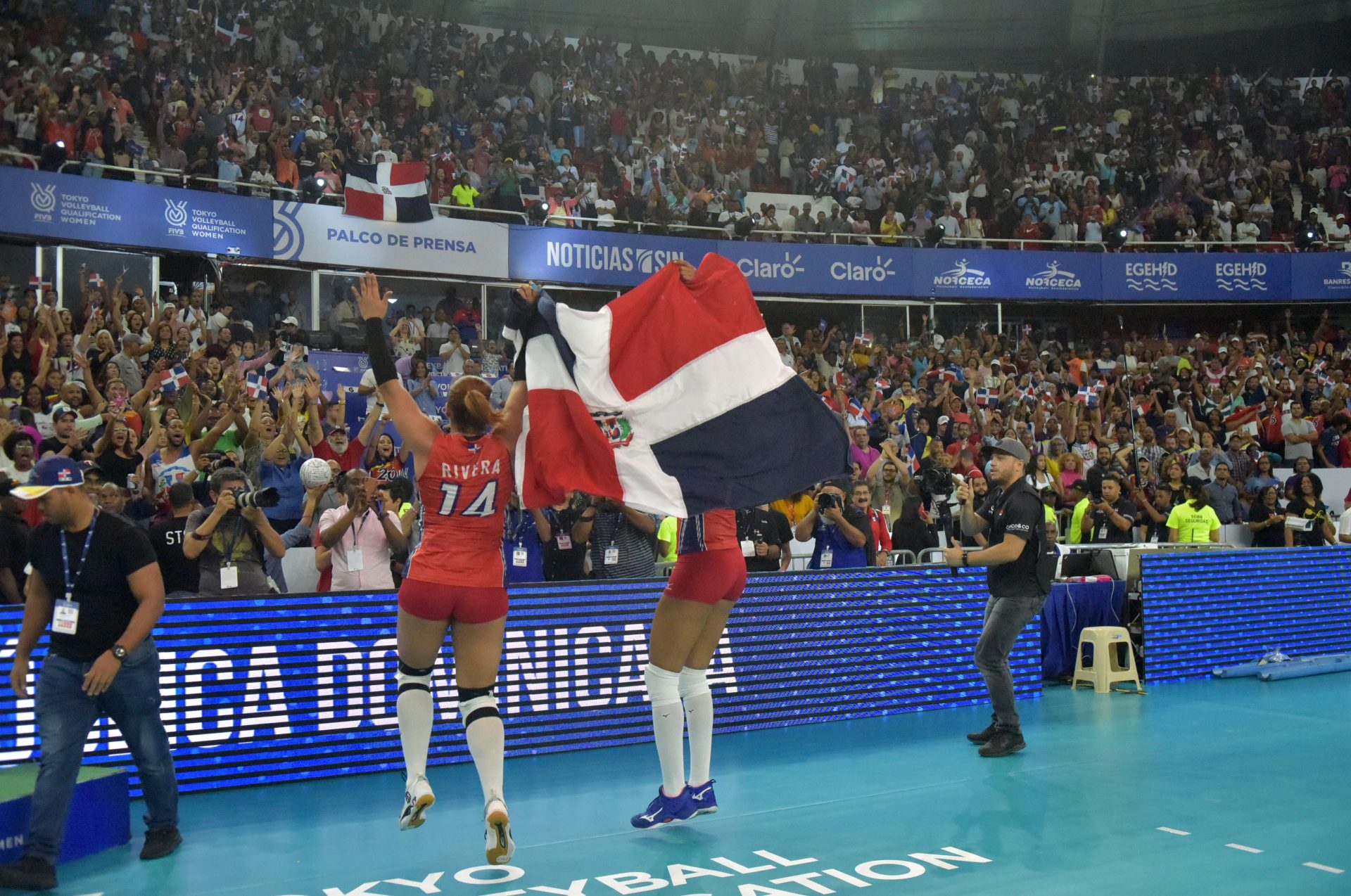 Priscila Rivera y otra de las jugadoras celebran con la bandera dominicana en alto el pase logrado para los Juegos Olímpicos de Tokio 2021.Fuente Externa