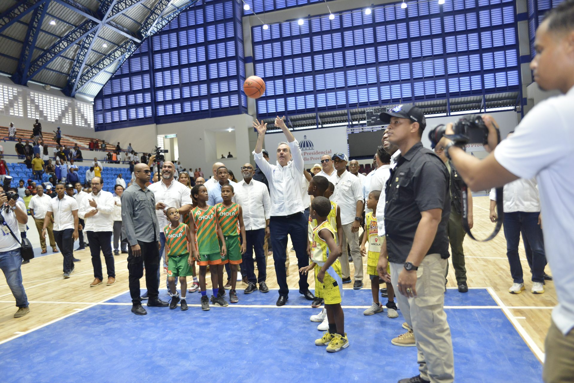 El presidente Luis Abinader hace un lance y encesto al reinaugurar el polideportivo Eleoncio Mercedes en La Romana. Fuente Externa