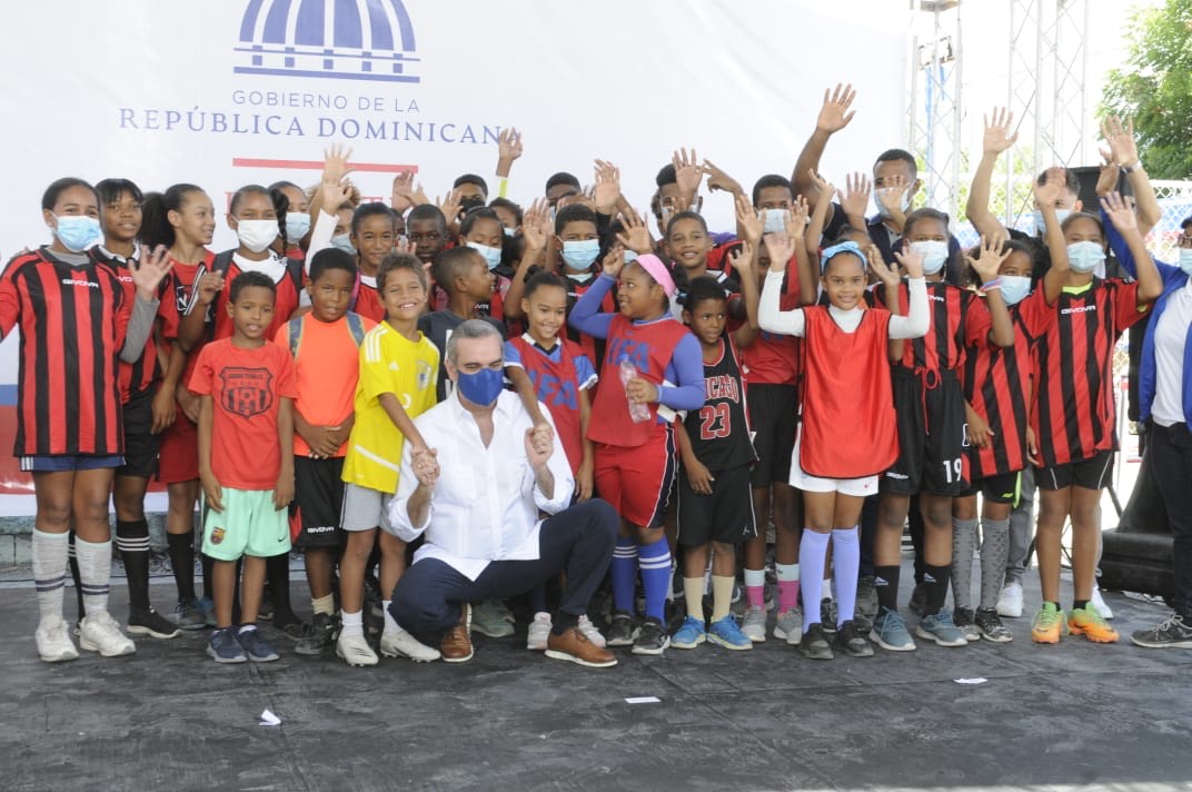 Al finalizar el acto, el presidente Abinader compartió con un grupo de pequeños y jóvenes atletas de la disciplina del fútbol, de la Academia Sabana Yegua FC, junto a su entrenador Alan Jiménez, quien le solicitó al presidente que le construyan una cancha para poder jugar en condiciones digna, porque carecen de tal instalación.