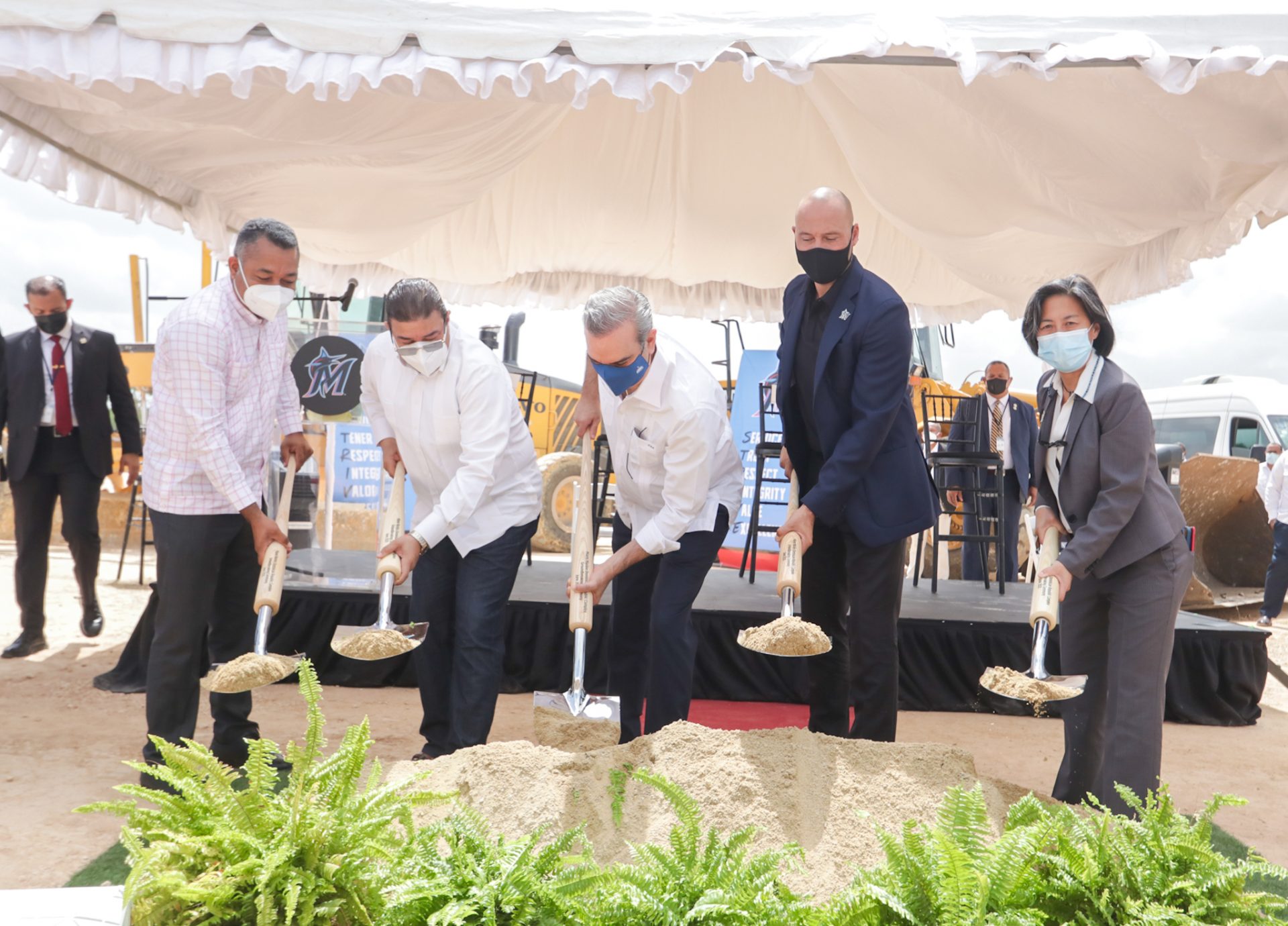 BOCA CHICA.- El presidente Luis Abinader encabezó este miércoles el inicio de la construcción de la academia de béisbol de los Marlins de la Florida, donde junto al ministro de Deportes, Francisco Camacho, el presidente ejecutivo y la gerente general de ese equipo, Derek Jeter y Kim Ng, ejecutaron el palazo simbólico para comenzar los trabajos.
