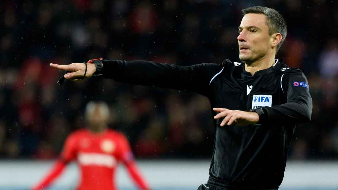 O árbitro Slavko Vincic durante partida entre Bayer Leverkusen e Porto pela Liga Europa 2019/20 Getty Images
