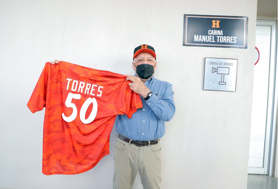 El gran colega también develó previo al inicio del segundo juego de la serie entre Naranjeros y Tomateros de Culiacán una placa con su nombre en la cabina de sonido del Estadio Sonora que desde ayer será conocida como la cabina “Manuel Torres”. El acto lo encabezó el Ing. Pablo de la Peña, director general de Naranjeros de Hermosillo.