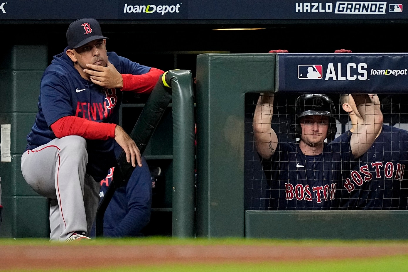 El boricua Alex Cora observa el sexto juego de la Serie de Campeonato de la Liga Americana ante los Astros, el 22 de octubre de 2021 en Houston. (The Associated Press)