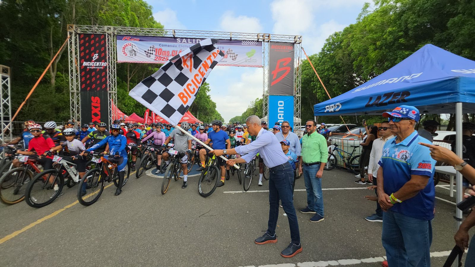 SANTIAGO.-El ingeniero Andrés Cueto, Director de Coraasan, dio el banderazo de salida y alrededor de 2000 pedalistas iniciaron el recorrido del X Clásico de Ciclismo MTB en honor al Patrón Santiago, que organiza el Comando Ciclístico del Norte (Cocinorte), que Rafael Solano Liz.