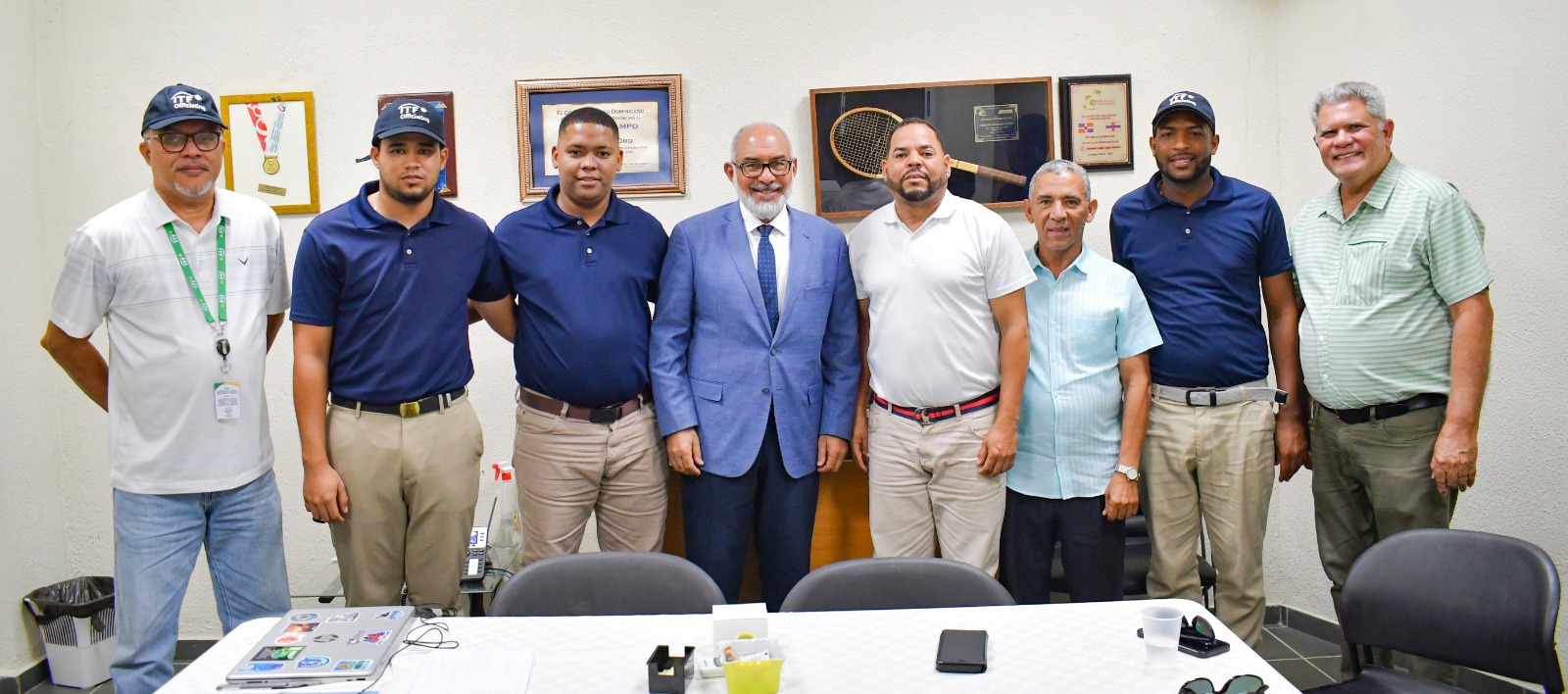 Los ejecutivos de la Fedotenis, Persio Maldonado, Rubén Tejeda, Alexis Alcántara y Sergio Tobal, junto con el hoy inmortal del Deporte Dominicano, Víctor Estrella y el capitán del equipo de Copa Davis, Johnny Berrido, estuvieron en el acto de entrega de insignias a los árbitros dominicanos, se mostraron optimistas y esperanzados en que harán un buen papel en los eventos que participarán como jueces.