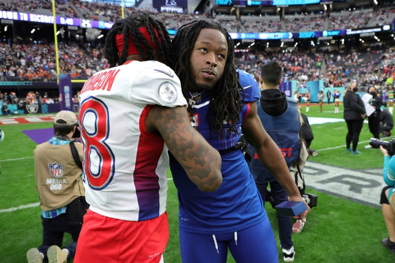 Alvin Kamara, de los New Orleans Saints, saluda a Diontae Johnson, de los Pittsburgh Steelers, en el Juego de las Estrellas del domingo en Las Vegas. Fuente Externa.