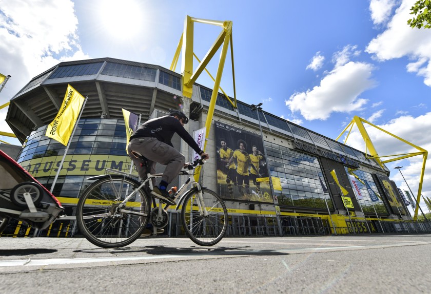 Un hombre pasea en bicicleta frente al Signal Iduna Park, el estadio más grande de Alemania y hogar del Borussia Dortmund, en Dortmund, Alemania, el jueves 14 de mayo de 2020. (AP Foto/Martin Meissner) (ASSOCIATED PRESS)