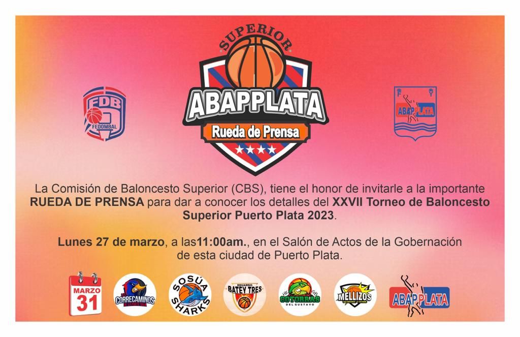 Puerto Plata.- La Asociación de Baloncesto de Puerto Plata (ABAPPLATA) anuncia la celebración para este lunes 27 del mes en curso a las 11 de la mañana en la Gobernación Provincial de esta ciudad su rueda de prensa para dar a conocer los detalles del Vigésimo Séptimo Torneo de Baloncesto Superior con refuerzos de esta ciudad.