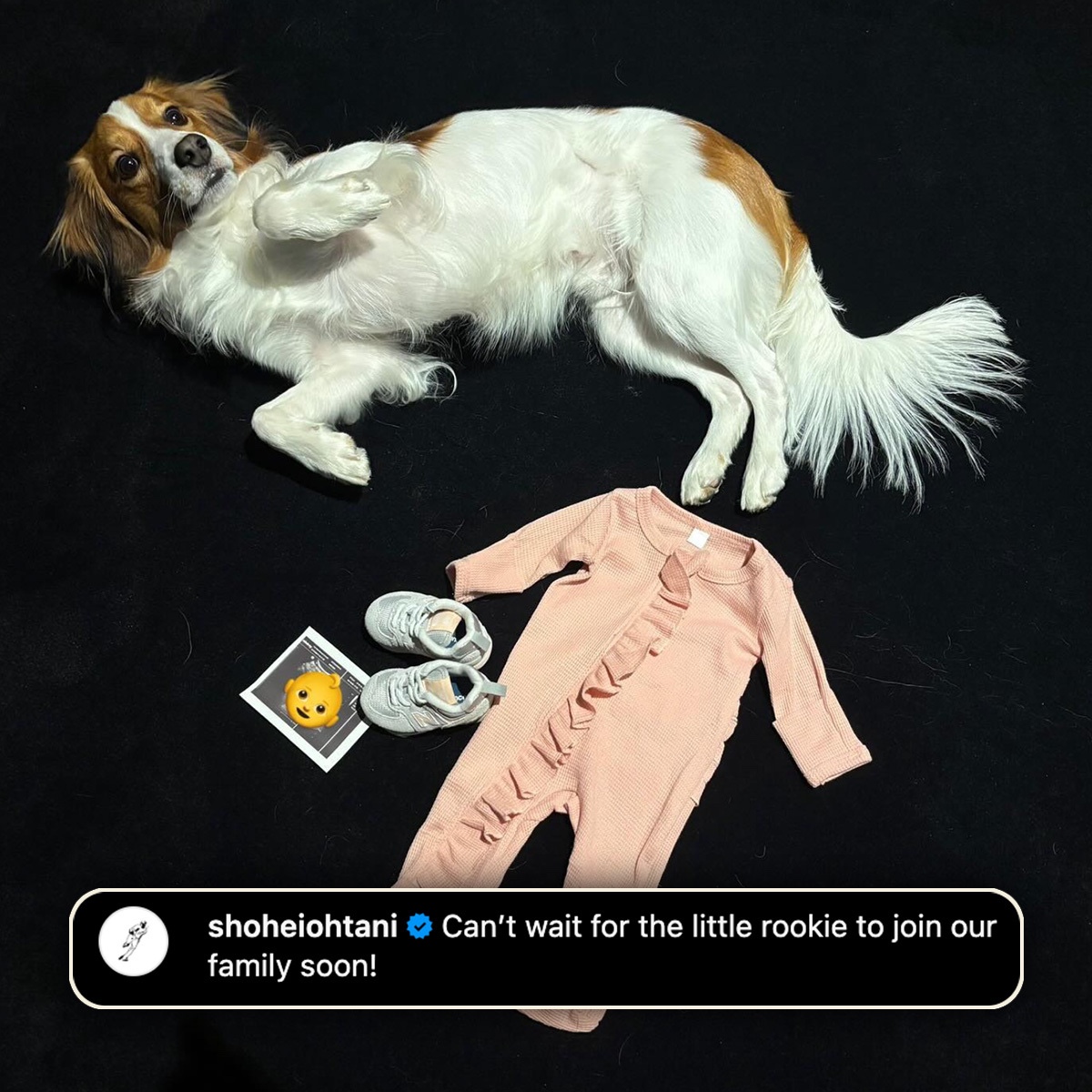 «¡No veo la hora de que el pequeño novato se una pronto a nuestra familia!» escribió Ohtani como pie de foto junto a una imagen de un enterizo de bebé, unos zapatitos y, por supuesto, su famoso perro Decoy.