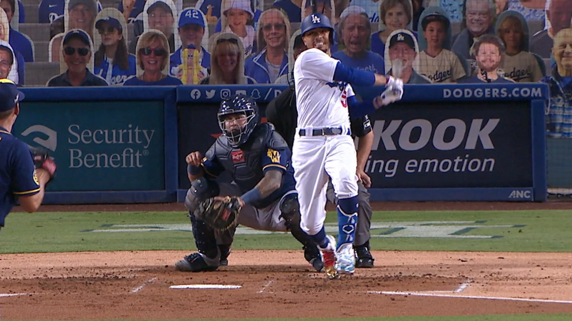 Los Dodgers se adelantaron 2-0 en la pizarra gracias a un doble de Betts que abrió el juego y a cuatro boletos del izquierdo Brent Suter (0-1) en el primer inning, igualando la marca de pases por bolas concedidos por un pitcher en un único episodio en postemporada. Betts anotó en un pasaporte a Will Smith con las bases llenas. Seager recibió también un boleto y llegó al plato en otro a AJ Pollock, también con las bases llenas.