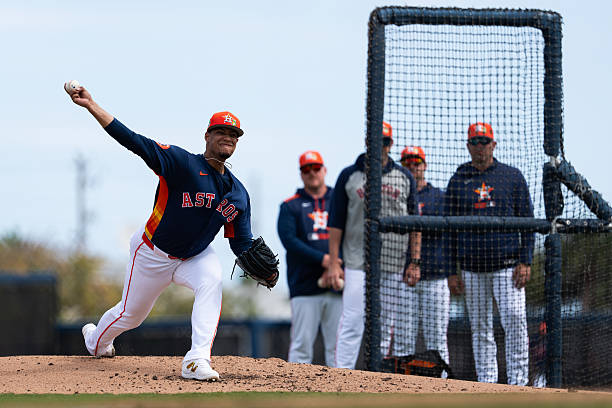 WEST PALM BEACH, FLORIDA - FEBRUARY 19: Bryan Abreu #52 of the Houston Astros pitches during spring training workouts at CACTI Park of the Palm Beaches on February 19, 2026 in West Palm Beach, Florida. (Photo by Houston Astros/Getty Images)