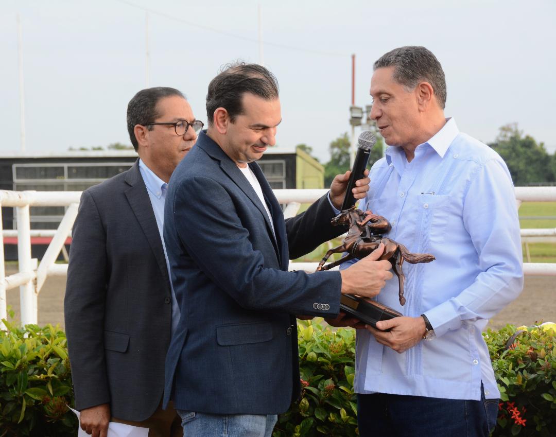Radhamés Senra (derecha), vicepresidente de la Comisión Hípica Nacional, entrega a Vladimir Reyes el trofeo correspondiente al entrenador del ejemplar ganador (Burlao) del Clásico Presidente Constitucional, el cual se disputó este sábado en el Hipódromo Quinto Centenario. Detrás, parcialmente oculto, Rafael Díaz, director de comunicaciones de la Comisión Hípica Nacional. Fuente Externa