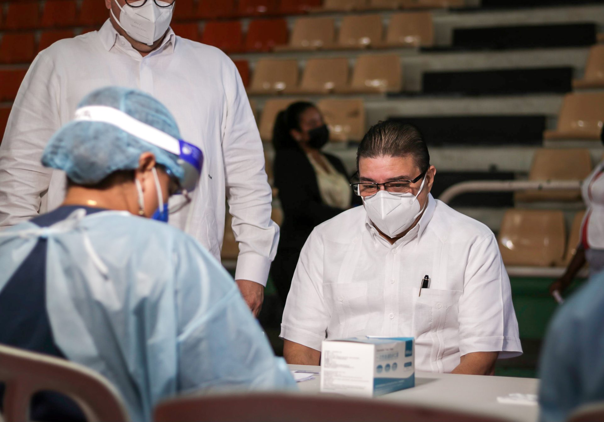 El ministro de Deportes Francisco Camacho mientras recibe la prueba de Antígeno por Isopado por parte de doctores del Ministerio de Salud. Fuente Externa