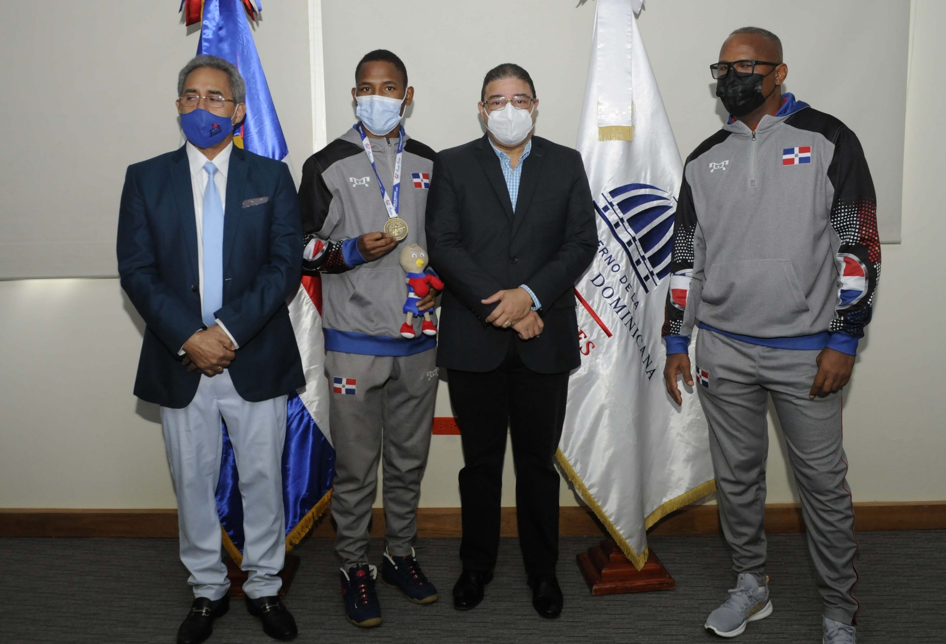 El funcionario recibió a De la Cruz junto al presidente de la Federación Dominicama de Boxeo, Rubén García, y el entrenador del boxeador, el cubano Armando Hernández.