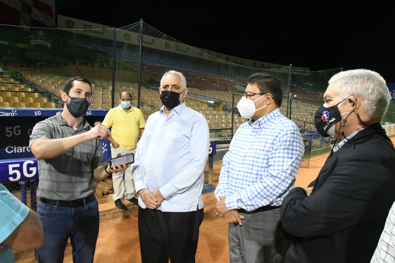Camacho recorrió el campo y otras áreas remodeladas por el Gobierno en el Estadio Quisqueya, y lo hizo en compañía del presidente de la Liga de Béisbol Profesional de República Dominicana, Vitelio Mejía; el de la Confederación de Béisbol Profesional, Juan Francisco Puello Herrera; el responsable de los trabajos, Garibaldi Bautista, y dos representantes de la empresa estadounidense Musco, especializada en iluminación de instalaciones deportivas.