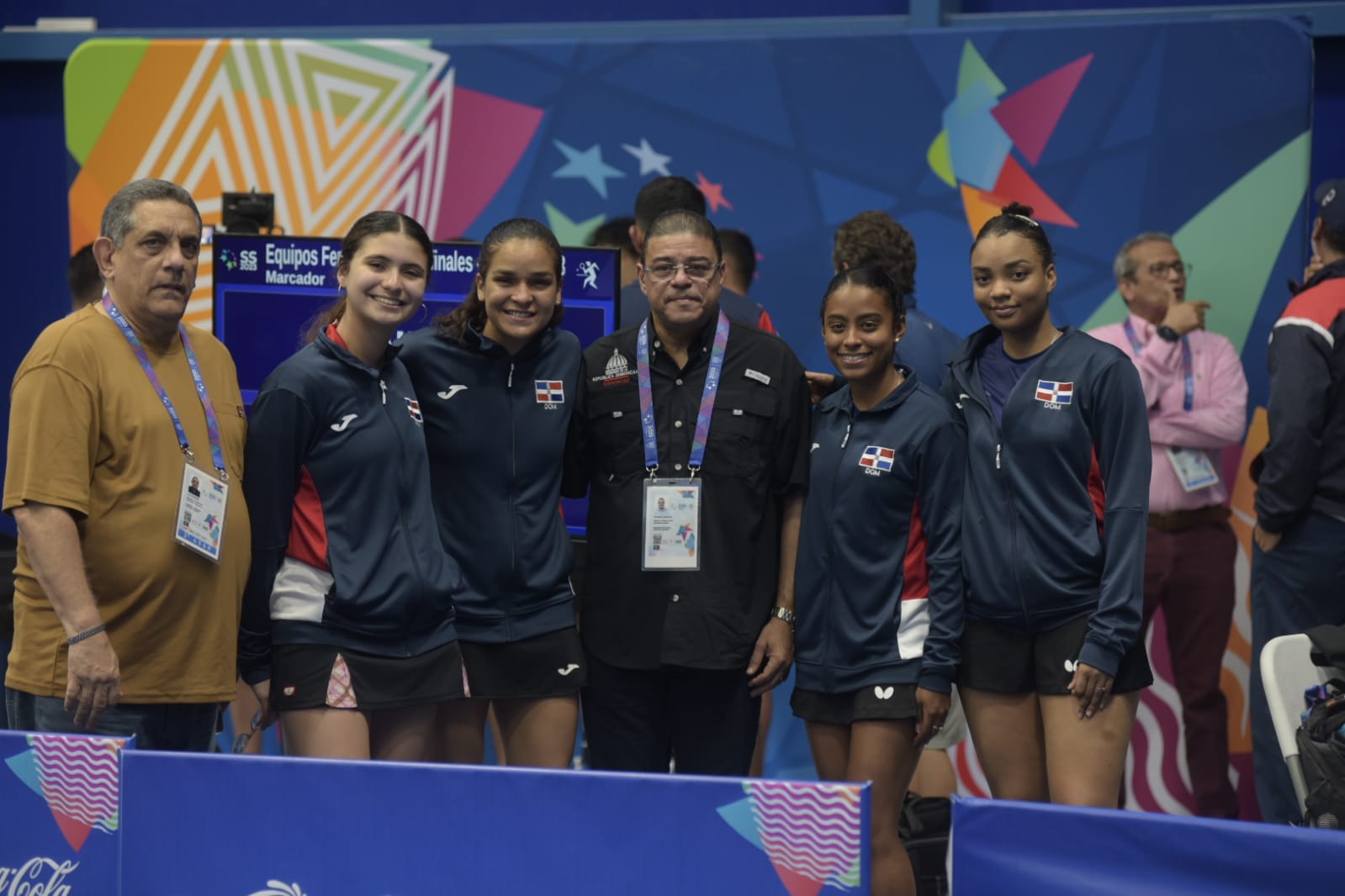 En el centro, Francisco Camacho, ministro de deportes y Luis Chanlatte, secretario general del Comité Olímpico Dominicaco, junto a las integrantes del equipo femenino de Tenis de Mesa conformado por Eva Brito, Esmerlyn Castro, Yasiris Ortiz y Shary Muñoz, quienes conquistaron la primera presea para la República Dominicana en los Juegos Centroamericanos y del Caribe Salvador 2023. Fuente Externa