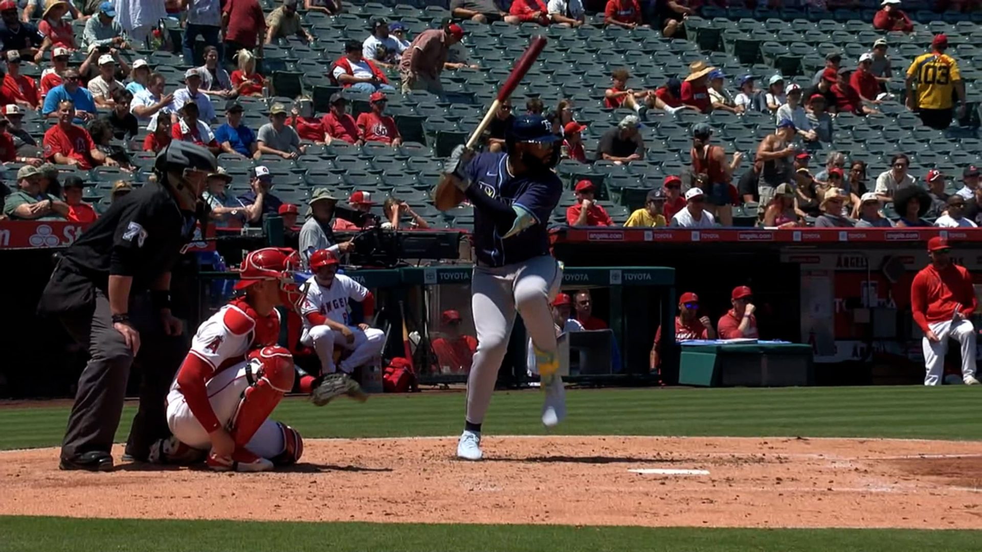 Después de mandar foul lanzamiento tras lanzamiento del abridor de los Angelinos, Tyler Anderson, Caminero conectó con fuerza un cambio colgado, manteniendo el bate extendido mientras corría hacia la primera base.