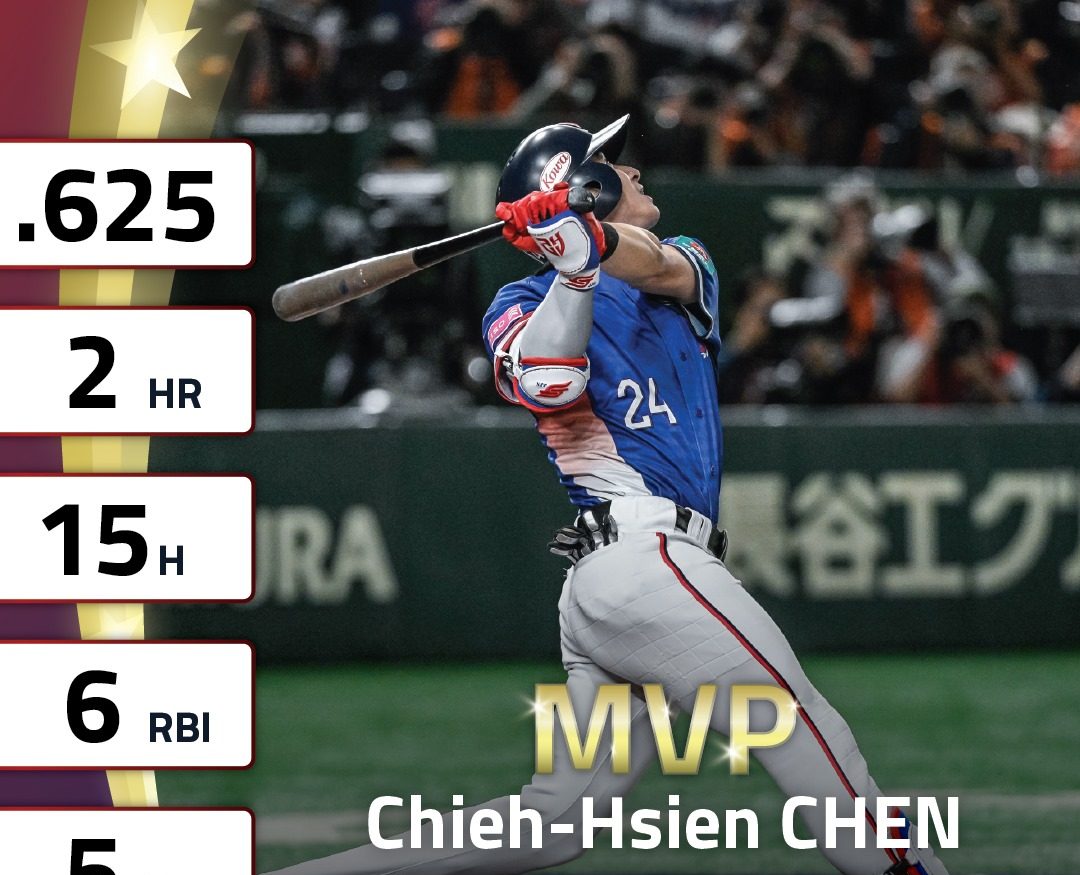 JAPON.- El capitán de Chinese Taipei, Chieh-Hsien Chen, abrió el marcador con un jonrón de tres carreras en la parte alta de la quinta entrada para ganar los honores de MVP, del torneo Premier 12 del 2024 WBSC.