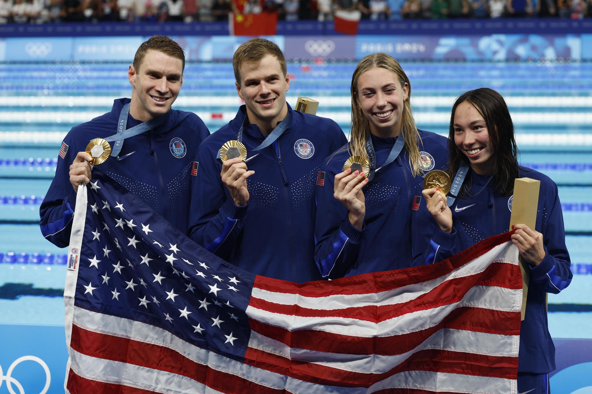 La medallistas de oro estadounidenses (I-D) Ryan Murphy, Nic Fink, Gretchen Walsh, y Torri Huske. EFE/EPA/MAST IRHAM