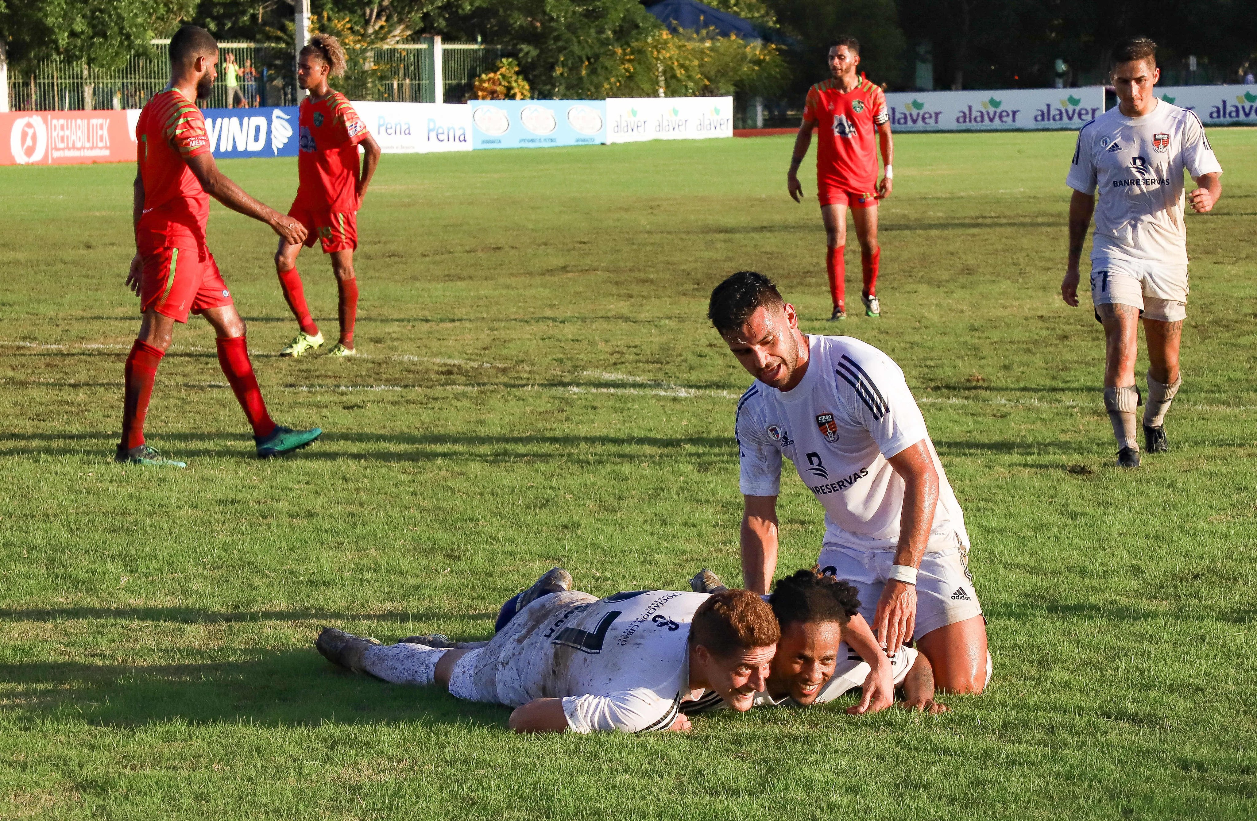 Deslizándose de cabeza celebran Germán Sosa y Charles Herold los goles anotados para Cibao FC./ Fuente Externa