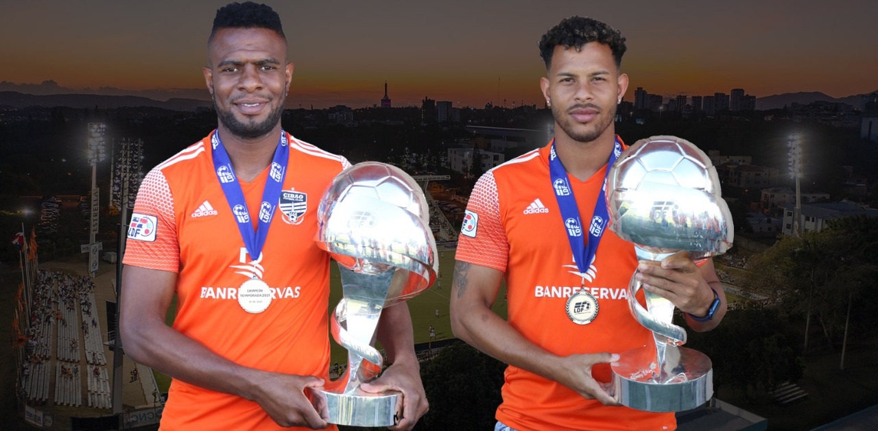 Julio Cesar Murillo y Adrian Salcedo posan con la copa de campeones 2021 del Cibao FC. Fuente Externa.