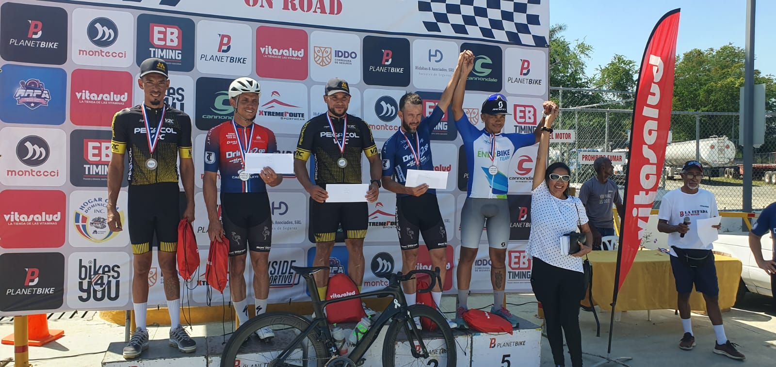 Campeones categoría Master D, (1ero) José Tejera (Drinks Team), (2do) Luis Ml Méndez (Drinks Team), (3ero) Francisco Muñoz (CCT), (4to) Víctor Franklin Polanco (Drinks Team),(5to) Víctor Abad (Capi Bike). Fuente Externa