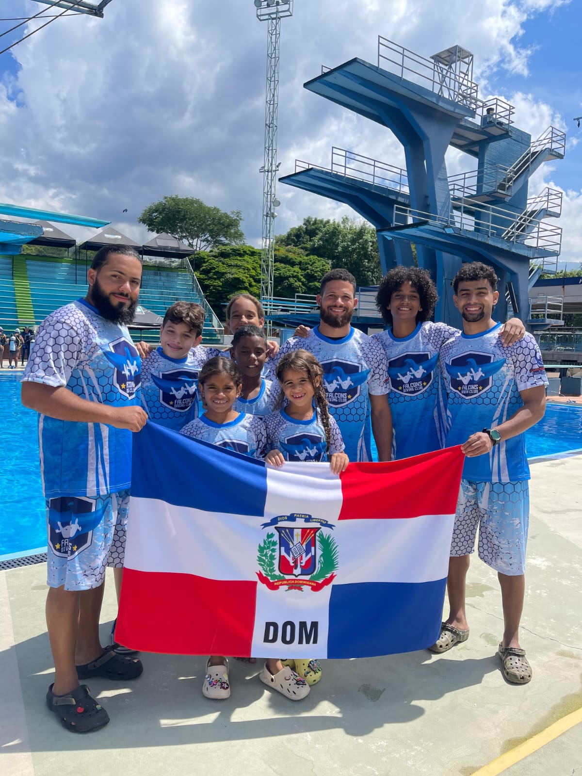 Los atletas dominicanos, ocho en total, seis niños, cuatro varones y dos hembras, además de dos adultos, pusieron la bandera en alto. El equipo fue capitaneado por el selección nacional y medallista de los Juegos Centroamericanos y del Caribe, Frandiel Gómez, presidente del Club Falcons Diving.