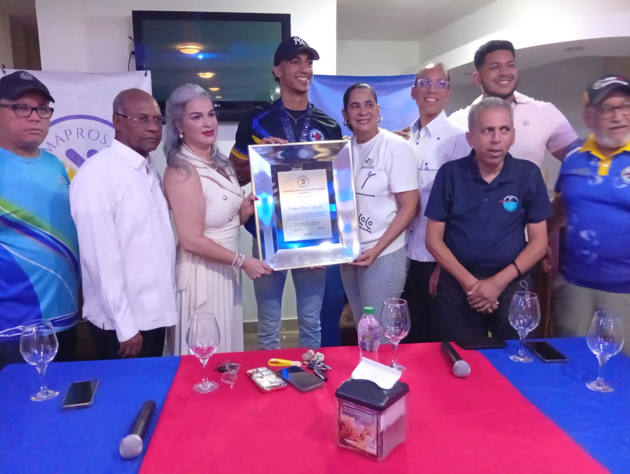 SANTIAGO.- La Junta Directiva del Club Amaprosan, rindió un merecido homenaje de recibimiento al destacado atleta local Cristian Ramos, tras conquistar la medalla de oro, en los 50 metros libres, en el Torneo Panam Aquatics Championship, Medellín, Colombia 2025.