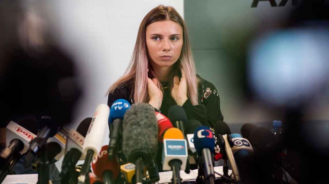 Krystsina Tsimanouskaya ofreció una conferencia de prensa a su llegada a Varsovia, temiendo sufrir represalias si volvía a Bielorrusia. LightRocket vía Getty Images