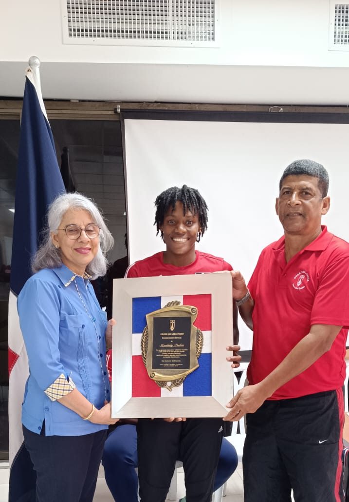 “Me enorgullece y me siento muy agradecida por el gesto y feliz de ver a estos niños y jóvenes combinando el estudio con el deporte”, manifestó Marileidy al recibir la placa de reconocimiento de manos de Paula Eliana y Armando Zayas, director de Deportes del San Judas Tadeo.