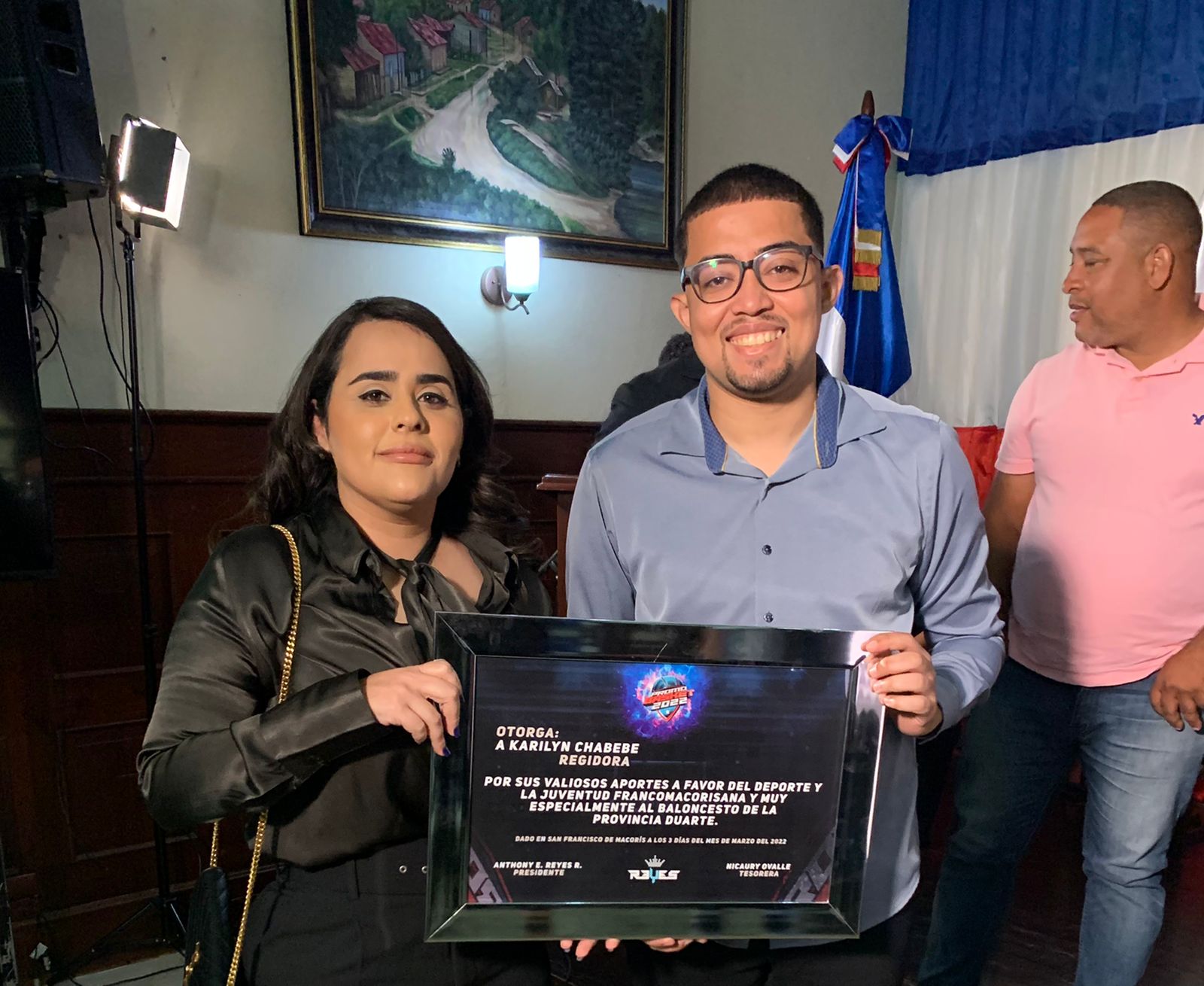 El acto protocolar continuó con la entrega de una placa de reconocimiento a la regidora Karilyn Chabebe a quien se le dedica el torneo por sus valiosos aportes en favor del deporte francomacorisano.