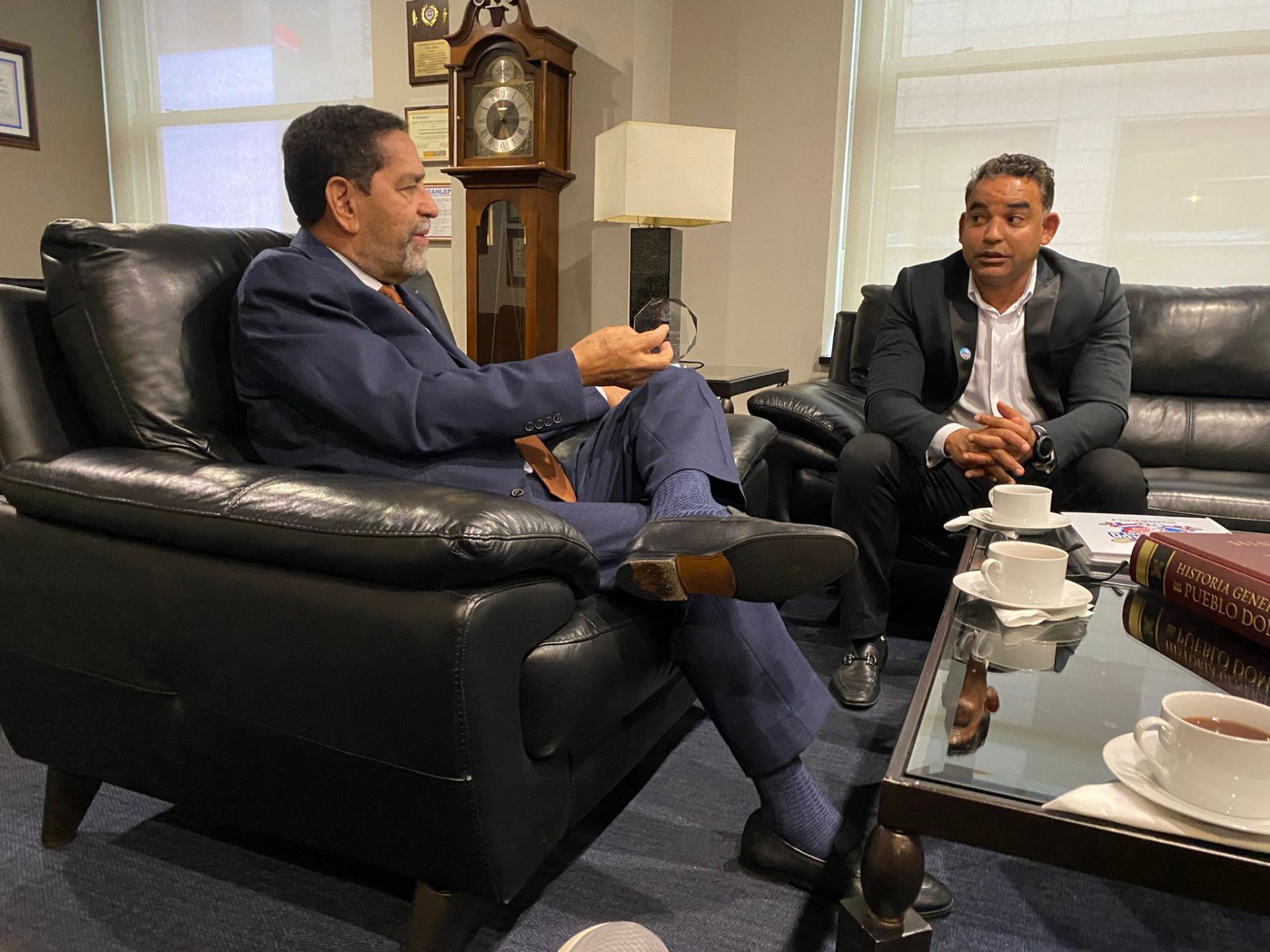 El Cónsul Dominicano en Nueva York, ingeniero Eligio Jáquez y el ex pelotero de Grandes Ligas, Quilvio Veras, comisionado de béisbol de Pequeñas Ligas, en una reunión en el despacho del funcionario consular. (Prensa/Cobepeli)