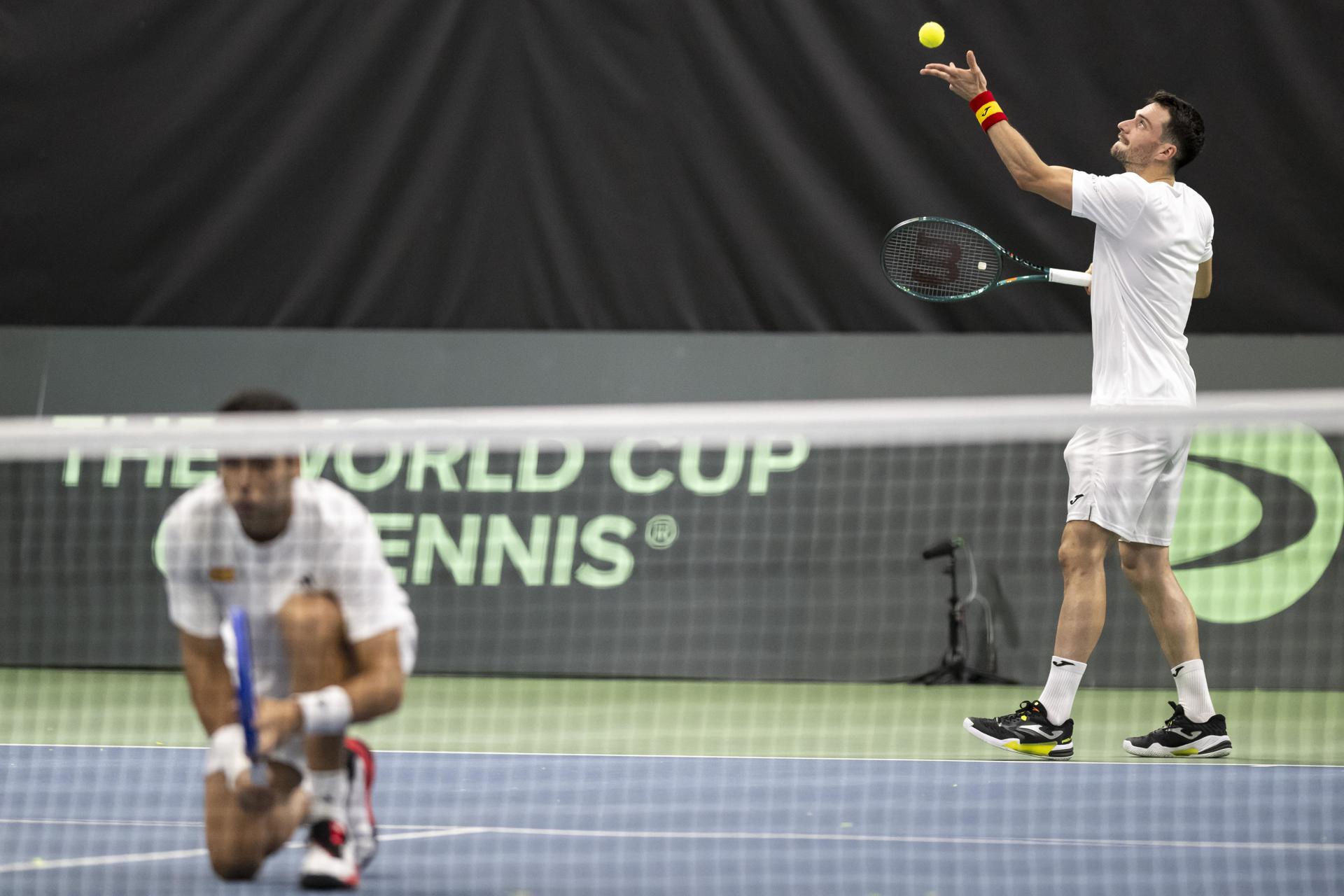 El español Jaume Munar (I) y Pedro Martínez durante el partido de dobles contra los suizos Marc-Andrea Huesler y Dominic Stricker en la eliminatoria de las clasificatorias de la Copa Davis entre Suiza y España en la Swiss Tennis Arena, en Biel, Suiza. EFE/EPA/ANTHONY ANEX
