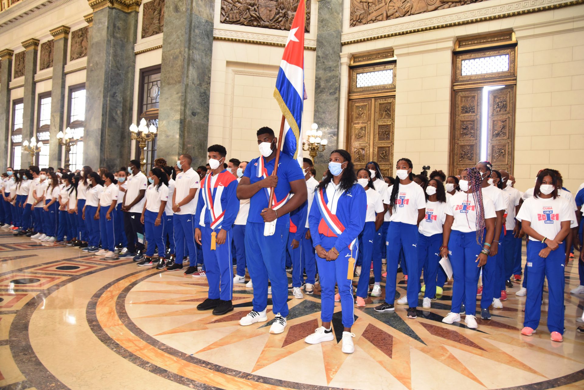 En el Capitolio Nacional, el presidente de la Asamblea Nacional del Poder Popular (parlamento), Esteban Lazo, entregó el estandarte en manos del rey mundial junior Juan Carley Vázquez (altetismo) y la finalista olímpica Katerhine Nuevo (canotaje), quienes encabezarán al colectivo en el desfile inaugural de la cita de Cali-Valle.