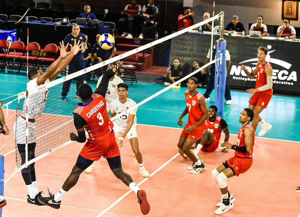 Guadalajara, agosto 18, 2023.- Cuba contuvo la presión de República Dominicana para vencerlos 3-0 (26-24, 25-23, 25-22) en el segundo juego de clasificación del 7-10 en la XVI Copa Panamericana Mayor Masculina de Voleibol.