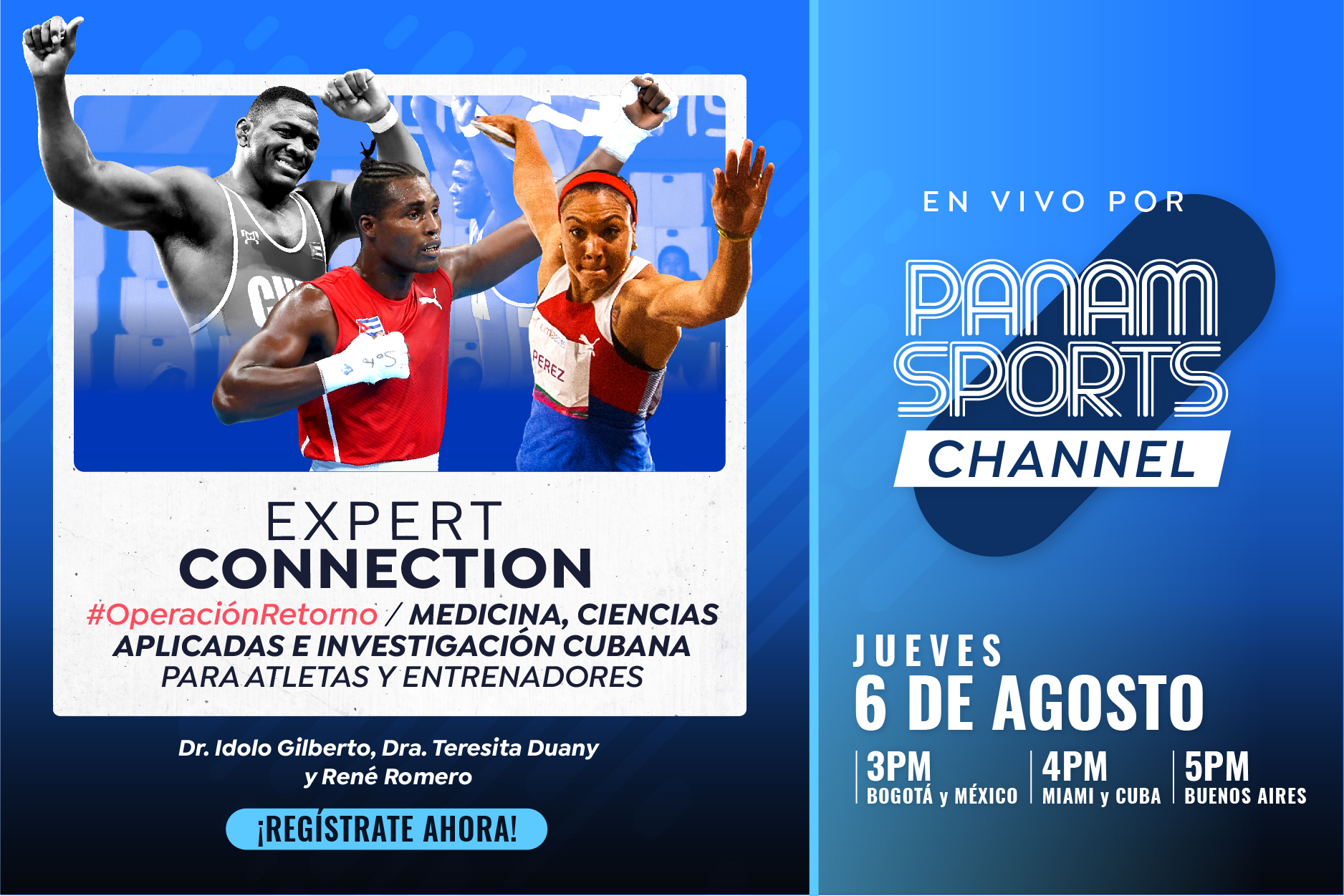 Ya lo saben, una oportunidad única de conocer la experiencia y conocimientos de tres grandes profesionales de Cuba que harán una clase magistral de medicina, ciencias aplicadas e investigación en materia deportiva en nuestro próximo Expert Connection. La cita será en vivo este jueves 6 de agosto a las 4pm (ET) en exclusiva por el Panam Sports Channel.