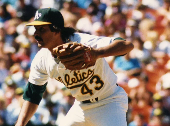 Dennis Eckersley se convirtió en el primer lanzador de relevo en conseguir cuatro salvamentos en una serie de postemporada, cerrando todos los juegos de la Serie de Campeonato de la Liga Americana de 1988. (Brad Mangin/Salón de la Fama y Museo Nacional del Béisbol)