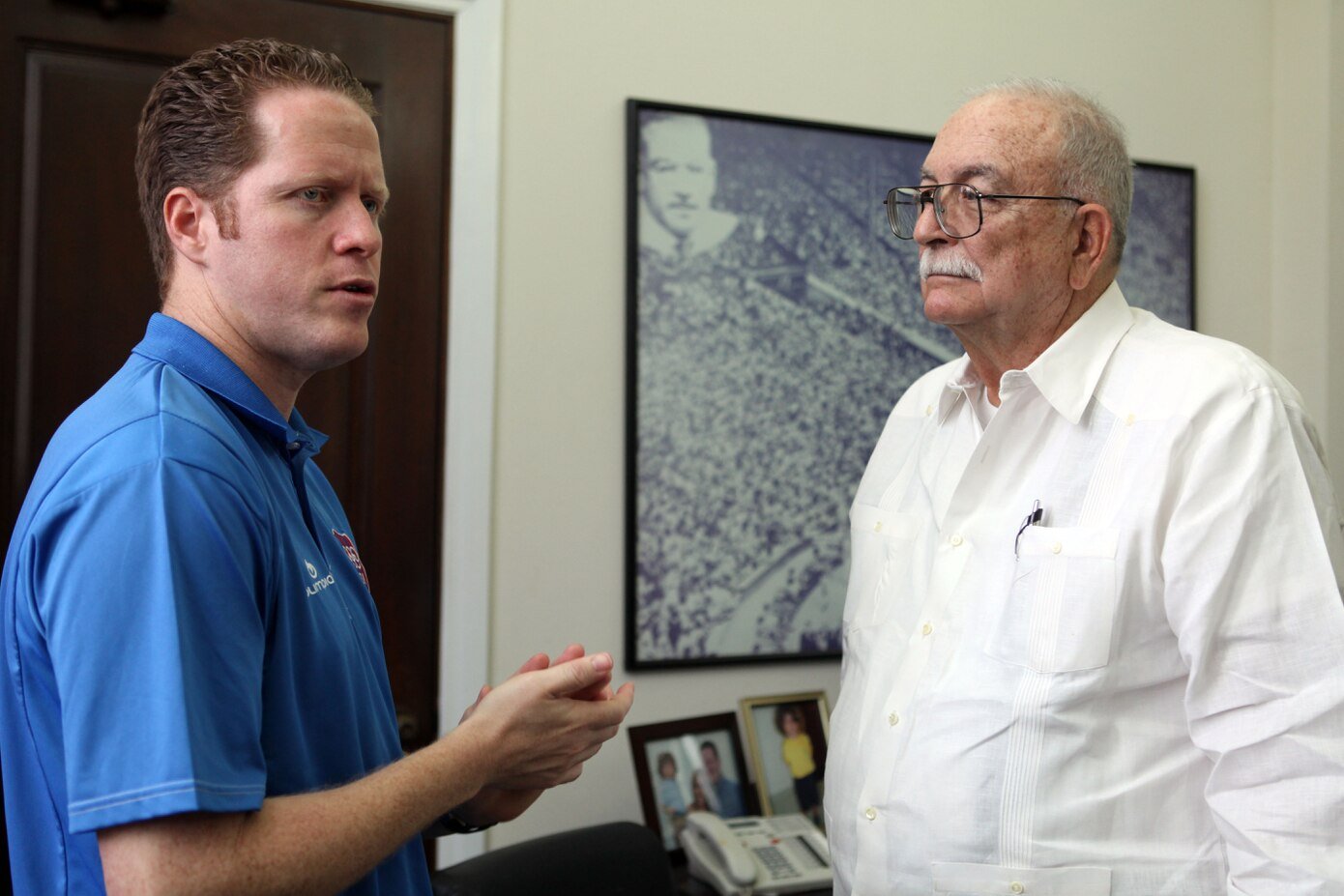 El ahora expresidente del Copur, David Bernier, y el juez federal Juan Torruella, conversan sobre la designacion del jurista como presidente de la Corte de Arbitraje de los Juegos Olimpicos de Londres 2012. (GFR Media)
