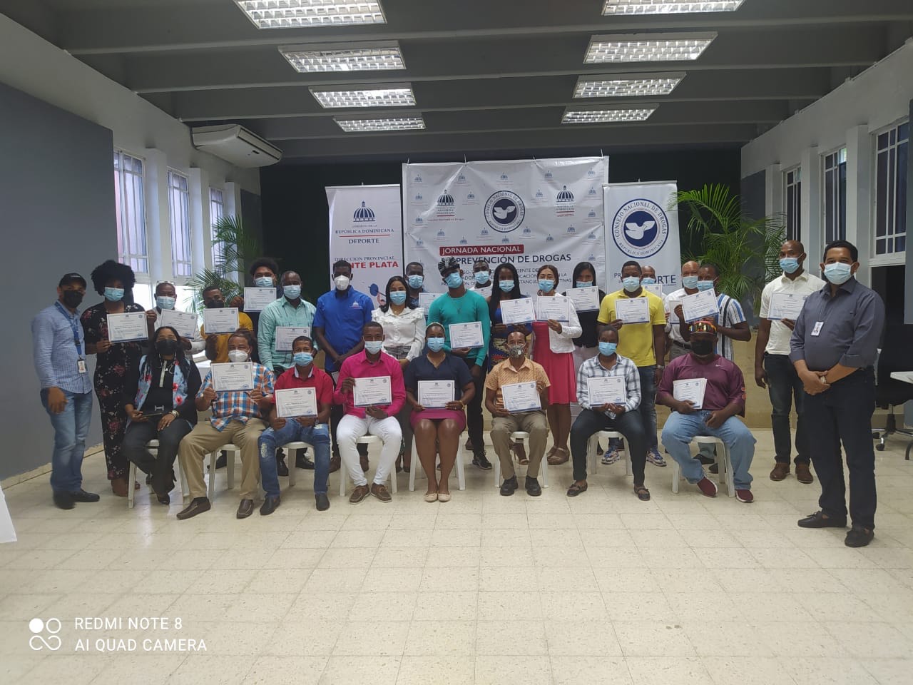 MONTE PLATA.- Más de 40 entrenadores y monitores deportivos de esta provincia fueron certificados como multiplicadores en materia de prevención contra el uso de sustancias ilícitas, luego de participar con éxito en el taller “Rol del Dirigente Deportivo, Entrenador y Profesor de Educación Física en la Prevención”, impartido por técnicos del Consejo Nacional de Drogas (CND), con el auspicio del Ministerio de Deportes (MIDEREC).