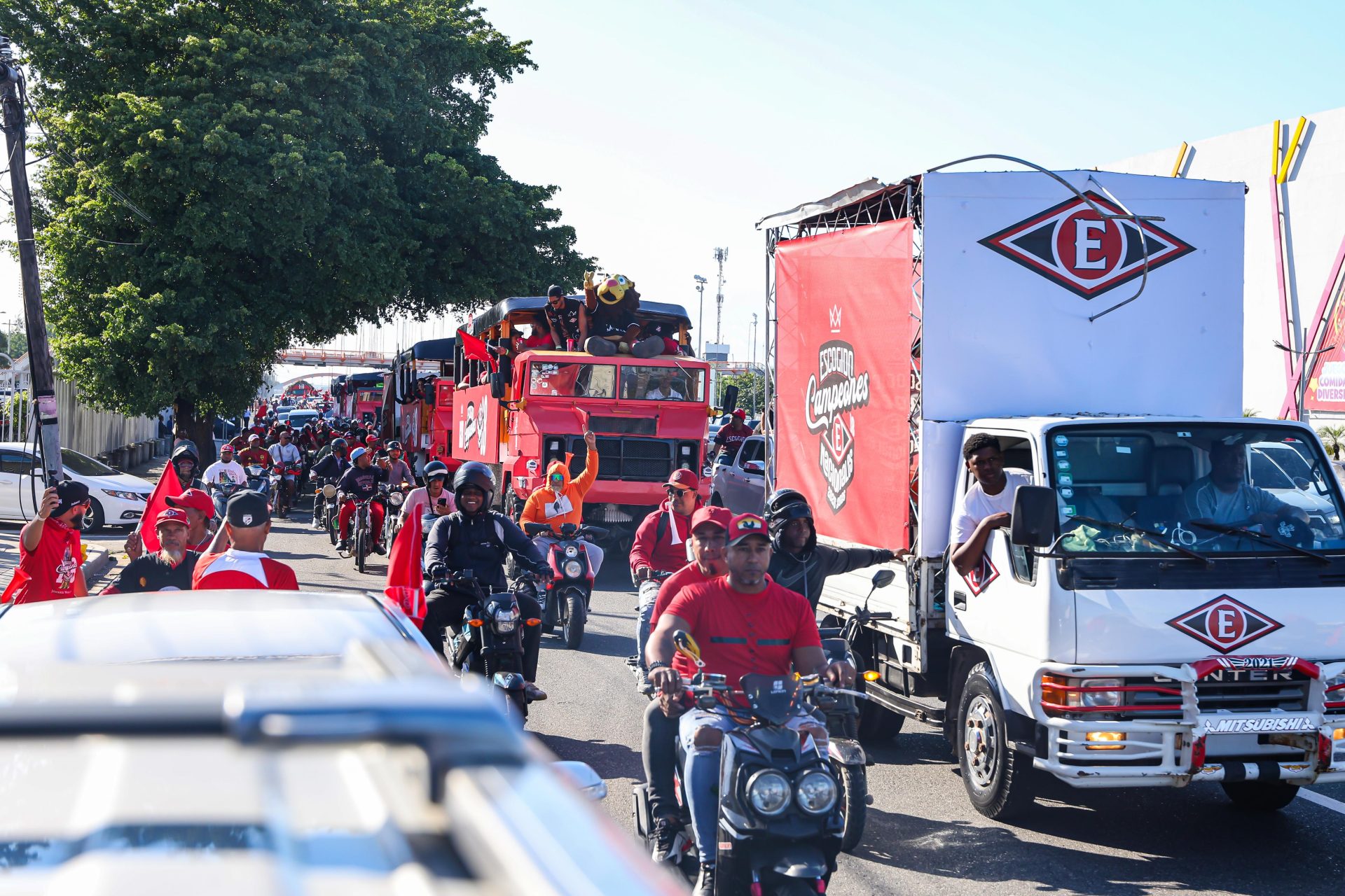 A medida que avanzaba el séquito con jugadores, coaches, directivos y sus familiares, así como Rufo y personal general de los bicampeones nacionales, se sumaron motores y carros con fanáticos que ondeaban sus banderas rojas por las calles capitaleñas.
