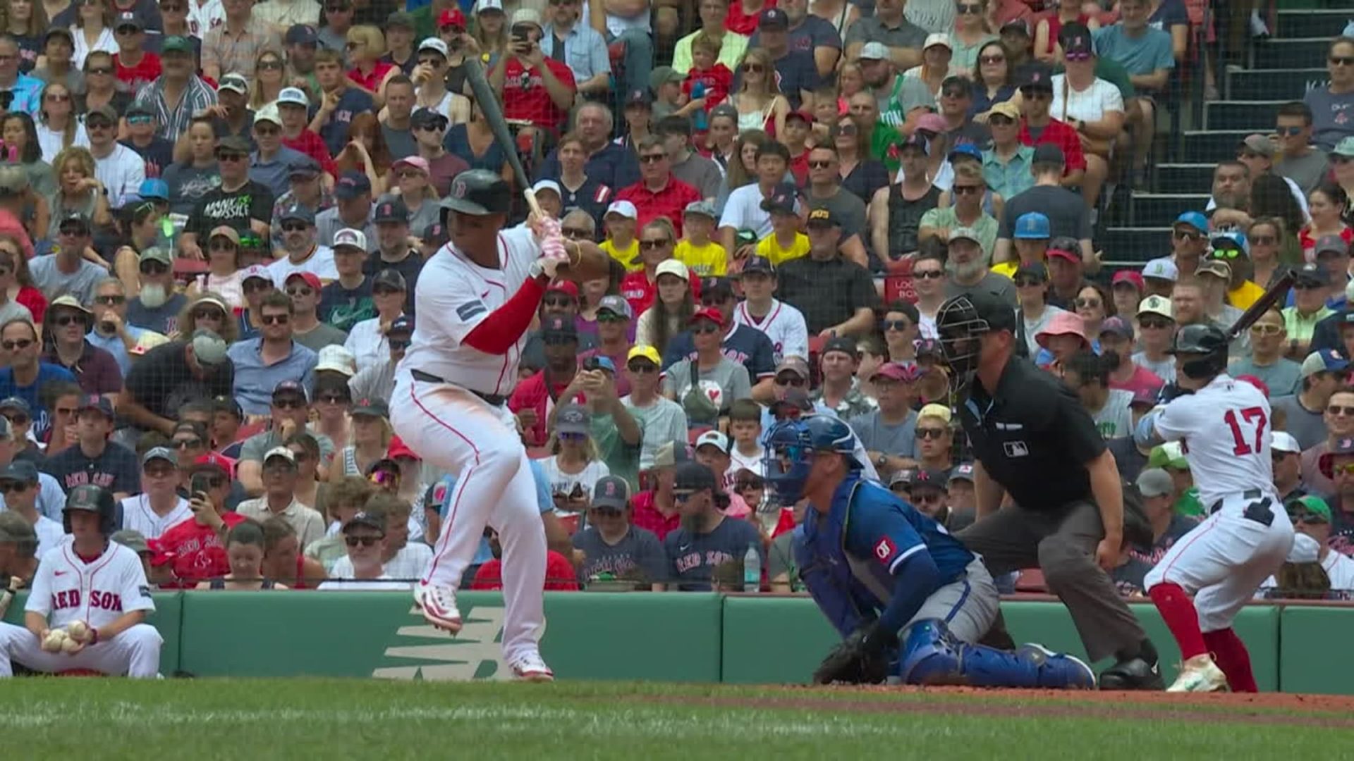 Devers, seleccionado al Juego de Estrellas, despachó en el primer episodio un slider de Brady Singer (5-6) con una velocidad de salida estimada de 114.7mph a una distancia de 439 pies que terminó estrellándose en la parte superior de un asiento zafando el respaldar de arriba. Los Medias Rojas publicaron un “Reporte de Incidencias en las Instalaciones de Fenway” que contenía una imagen del asiento rojo asiento en sus redes sociales.