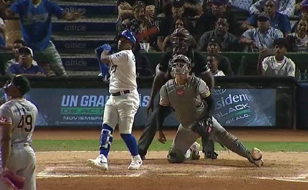 Leyba le sacó su primer jonrón en Round Robin a un sinker que le sirvió Jhan Mariñez y que salió de su bate a 100 millas en conteo de 2-1 y un out en la séptima por el bosque derecho remolcando a Sergio Alcántara y Francisco Mejía.