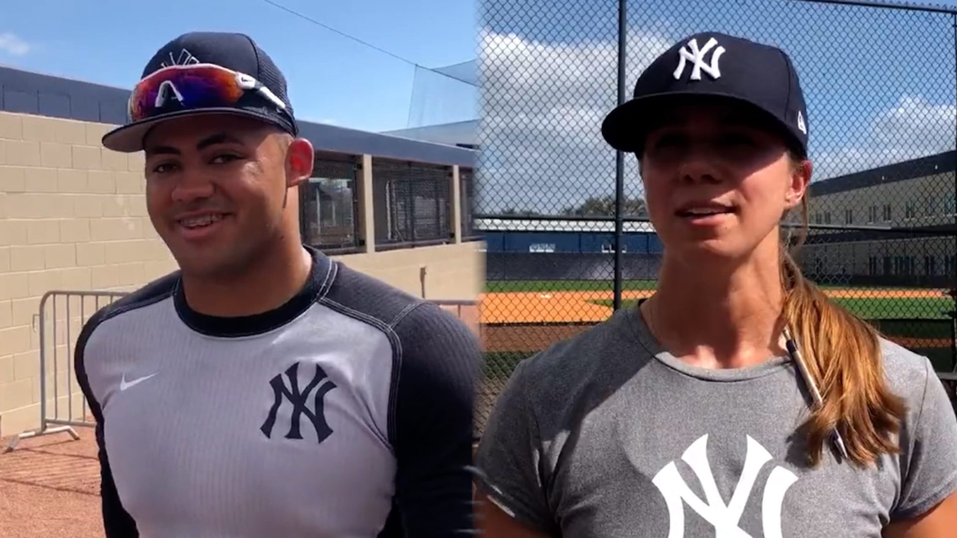 Jasson Domínguez junto a la entrenadora Balkovec, de los Yankees. Fuente Externa.