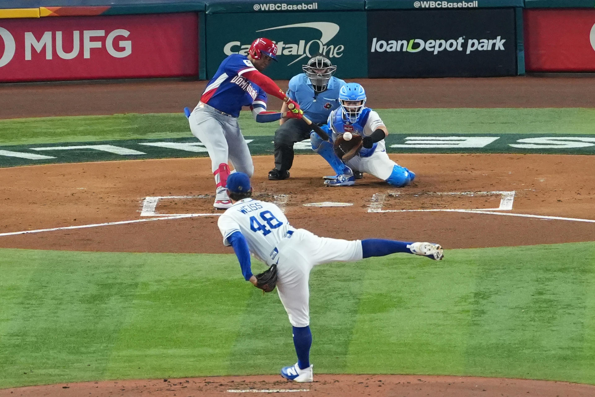 Juan Soto (arriba) de Dominicana batea una bola en un partido del Clásico Mundial de Béisbol. EFE/ Alberto Boal