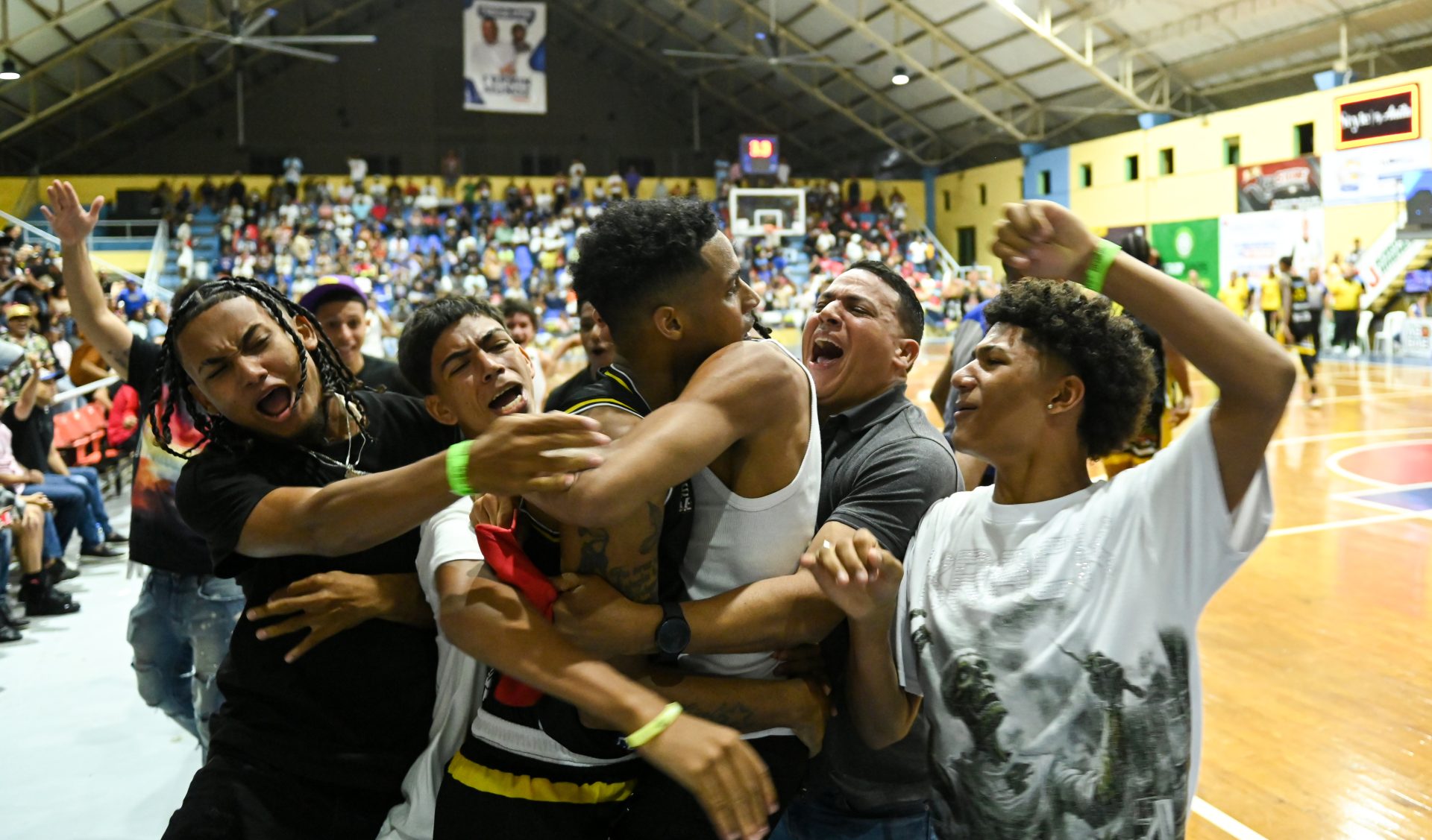 Mikael Urena celebra con los fanaticos del Don Bosco después de anotar el tiro de tres decisivo en la victoria de su equipo ganador de la serie regular. Fuente Externa