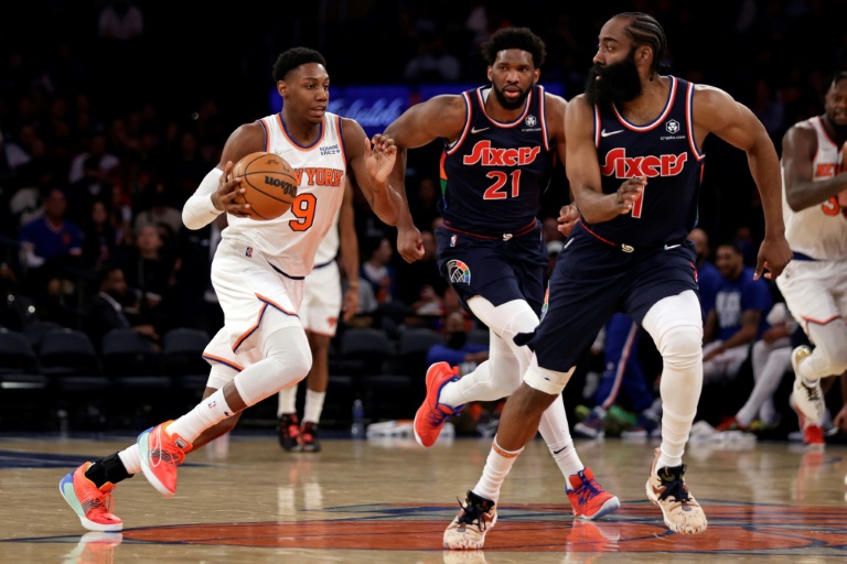 RJ Barrett, de los New York Knicks, en posesión de la pelota, presionado por Joel Embiid (c) y James Harden, de los Philadelphia 76ers, en un partido de la NBA el 27 de febrero de 2022 en Nueva York. Fuente Externa.