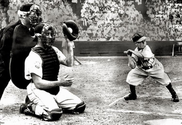 Edward Carl «Eddie» Gaedel, tomando su primer turno en grandes ligas y recibió una base por bolas/ Fuente Externa